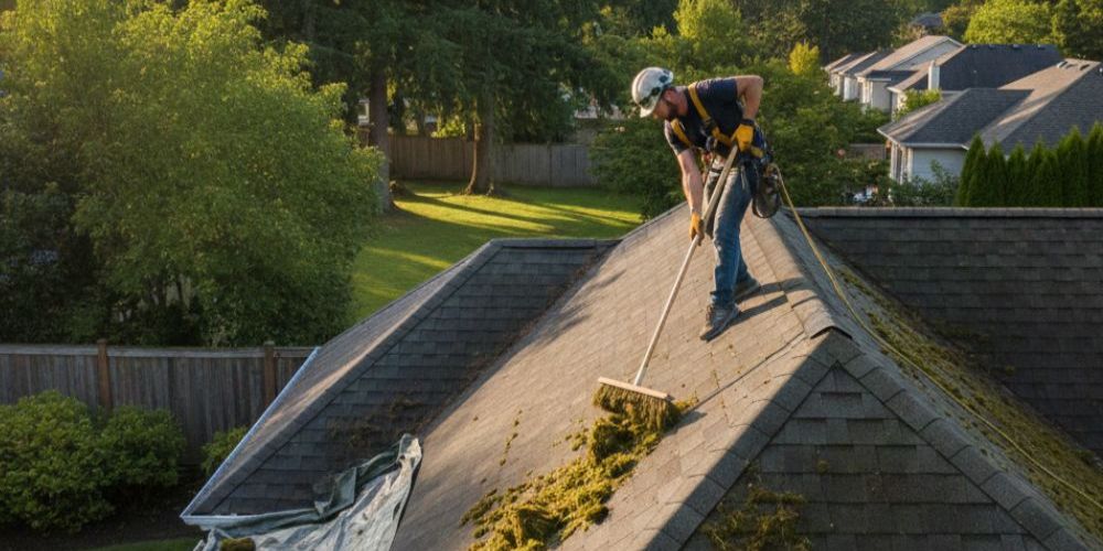 We use roof-safe soft washing to treat moss and algae at the root without damaging shingles. Valleys and transitions are cleaned to improve drainage and extend roof life.